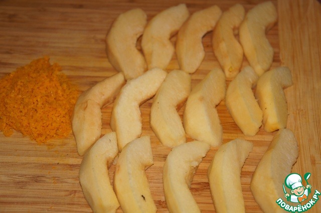 Айву очистить и каждую разрезать на 8 долек.