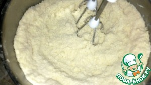 • В миске с помощью миксера с насадкой "венчики" смешать до состояния равномерной крошки муку, с порезанным на маленькие кусочки маслом из холодильника + разрыхлитель+ соль.
