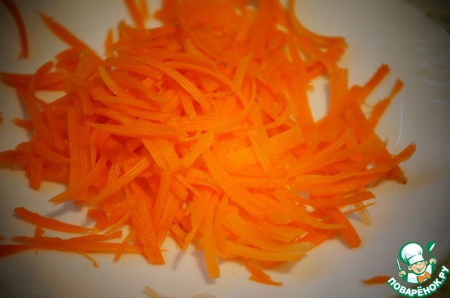 Морковь помыть, почистить, нашинковать тонкой соломкой. Можно слегка сбрызнуть растительным маслом.