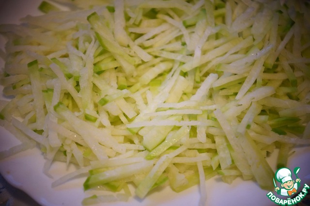 Редьку помыть, почистить, нашинковать тонкой соломкой, сбрызнуть маслом.