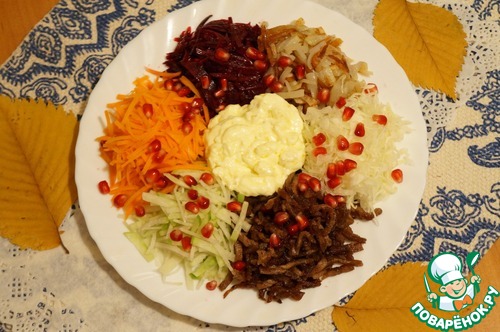 На большом блюде разложить одинаковыми горками свёклу, морковь, редьку, капусту с луком, мясо и картофель.