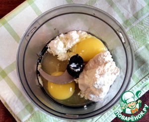 Вначале приготовим тесто. Для этого 100 г творога взбить в блендере с 2 яйцами до однородности.