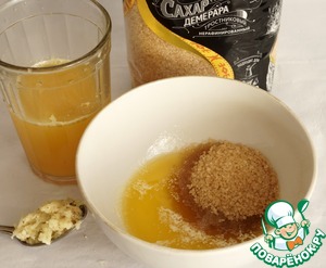 Масло растопить, добавить к нему коричневый сахар, апельсиновый сок и натертый имбирь.
