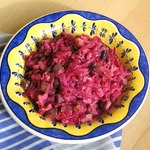 Свекла наша остыла, натираем ее на крупной терке. Добавляем к нарезанным продуктам, туда же отправляем лук.