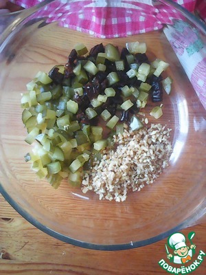 Огурец и чернослив нарезаем кубиками, а орехи мелко.
