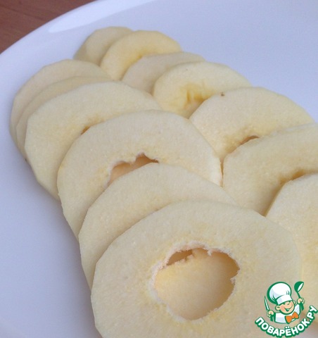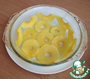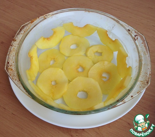 Смазываем форму сливочным маслом и выкладываем произвольно колечки айвы.