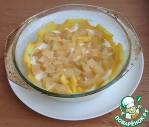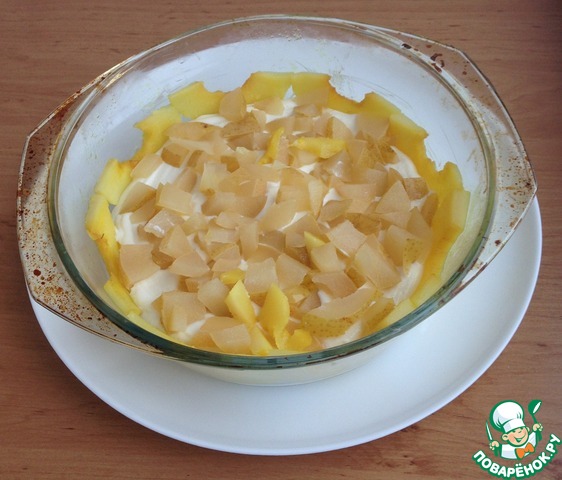 Затем вливаем половину творожный массы, сверху распределяем мелко порезанную грушу.