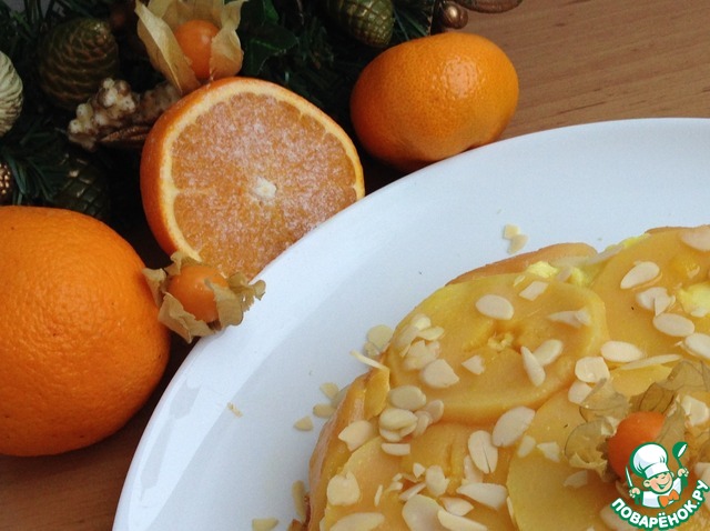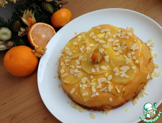 Готовому пирогу дать остыть. Если вытащить из формы горячим, то он может деформироваться. Перевернуть аккуратно на блюдо, сверху полить соусом ( сахарное масло после айвы смешать с медом) и посыпать миндальными лепестками.