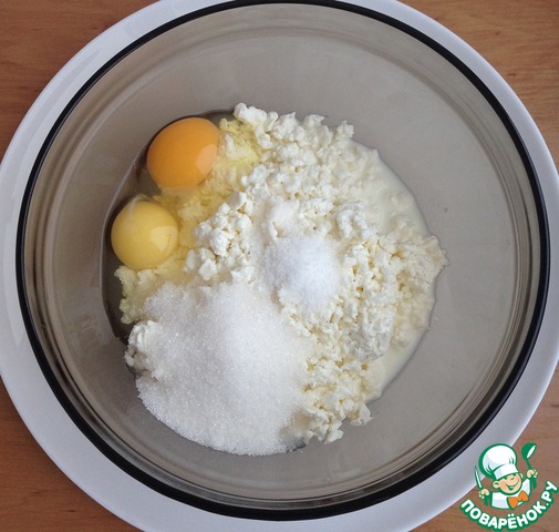 В миске смешиваем творог, яйца, сахар, молоко, ванильный сахар и соду (ее погасит творог). Перемешиваем все блендером до однородной массы.