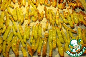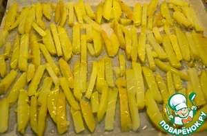 1. Разогреть духовку до 220С. Картофель порезать на длинные тонкие палочки (толстой соломкой) и бросить в кипящую воду. Отварить 2 минуты, слить воду и высушить на бумажных полотенцах.