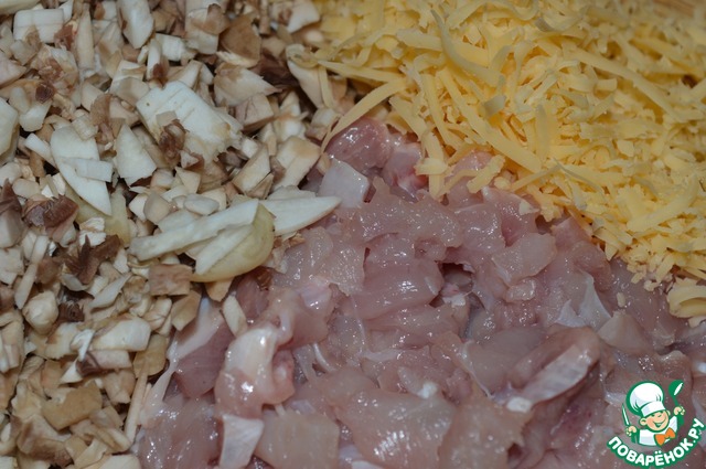 Грибы и срезанное с костей мясо измельчить ножом. Сыр и один зубчик чеснока натереть на мелкой терке. Посолить, поперчить и перемешать.