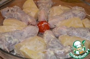 Картофель очистить и нарезать дольками. Фаршированные голени и артофель смазать майонезом и выложить в форму для запекания.