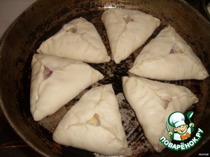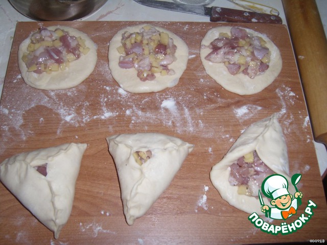 Раскатываем, но не тонко, буквально один раз проводим скалкой. Кладем начинку. Защепляем треугольником.