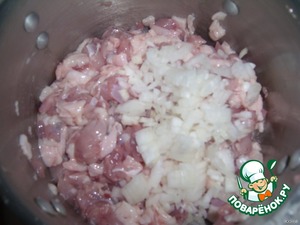 Мелко режем куриное мясо (по рецепту должен быть гусь, но мы обойдемся ножками Буша), лук.