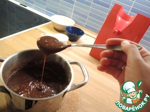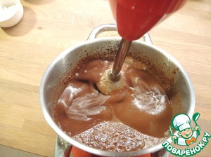 Теперь добавляем разломанный шоколад и перемешиваем блендером. Будьте очень-очень осторожны, температура масла 200 градусов, сами понимаете, повышенная опасность. Кастрюльку наклоняем от себя и на медленных оборотах, контролируя направление каждого булька, добиваемся однородной массы. Даем остыть, примерно 15 мин. Нужно, чтобы терпел палец, иначе свернутся яйца.