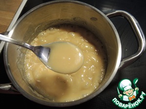 А вот тут через 10 мин, масло и сахар превратились с однородную тянучую массу, и пошло изменение цвета. Вначале появилась белая пена, потом она исчезла и стал появляться коричневый оттенок. Я остановилась на карамельном цвете, боялась что пригорит (новую кастрюльку прикупила недавно, жалко). В другой раз, может быть, попробую подержать подольше.