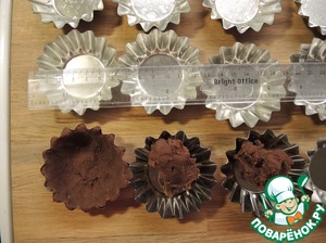 Разделяем тесто на количество формочек, и вдавливаем его туда. Я, как и писала, делала половину, потому что нашла только 18 формочек. Диаметр примерно 6 см. Вот, даже линейку приложила, чтобы было понятнее.