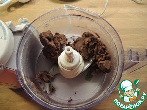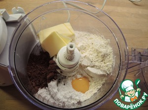Смешать вместе масло, муку, сахарную пудру и какао. Я все поместила в кухонный комбайн, и через 1 мин получилось тесто.