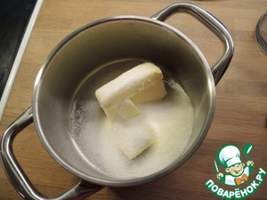 Растопить сливочное масло, добавить сахар и медленно помешивая до светло-коричневого цвета. Вот тут я когда делала, ошиблась в переводе, забабахала в кастрюлю вместе и масло и сахар. Потом, когда стала писать для сайта, поняла, но было поздно. Но, в следующий раз сделаю "по науке".