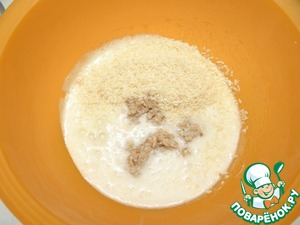 К яичной массе добавить соль, кокосовое молоко, кокосовую стружку, хлопья, перемешать.