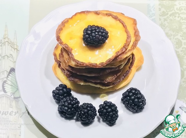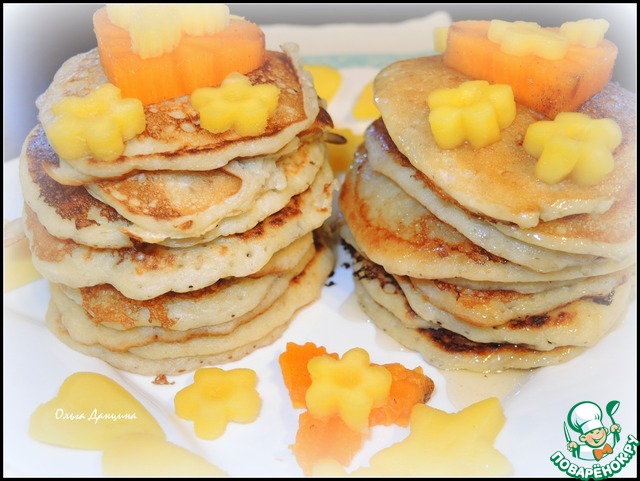 Из киви и банана я делаю с помощью вырубок цветочки. Подаю оладьи, украсив цветами из фруктов и полив медом. Приятного Вам аппетита!