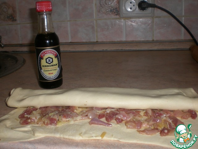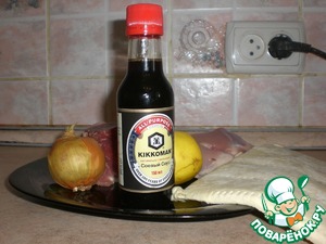 Нам понадобится соевый соус Kikkoman, по кусочку свинины и курицы, слоеное тесто, лук и лимон.