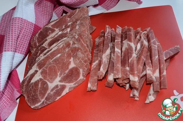 Свинину надо нарезать на полоски шириной и толщиной 5 мм. Лучше и проще это делать, когда свинина слегка подморожена.