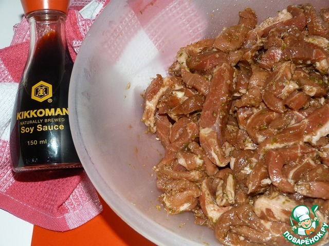 После накрыть крышкой и поставить в холодильник. Мясо должно мариноваться не менее 2-х часов. Можно поставить на ночь.