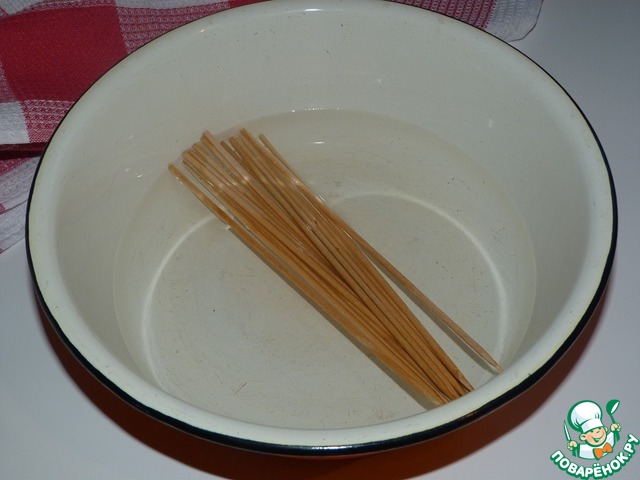 Пока мясо маринуется, приготовьте деревянные шпажки (тайцы используют бамбуковые). Шпажки надо положить в подходящую по размеру ёмкость и залить водой.