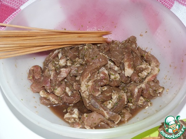 P.S. У меня получилось 19 шпажек с шашлычками, поэтому готовила шашлыки в два захода. Первый раз - 9 шт. на решетке, второй - 10 шт. -