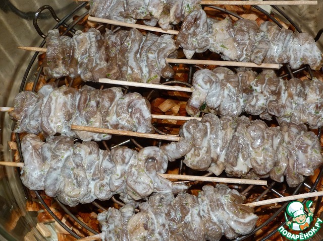 Теперь предстоит еще одна кропотливая работа - нанизываем на шпажки полоски мяса "гормошкой".
