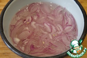 Лук тонко нашинковать четверть кольцами и замариновать в слабокислом растворе уксуса с добавлением 1 ч. л. сахарного песка на 15-20 минут.