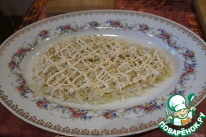На овальное блюдо выложить картофель, натертый на крупной терке, придав ему форму шишки. Сверху нанести сеточку из майонезно-соевого соуса.