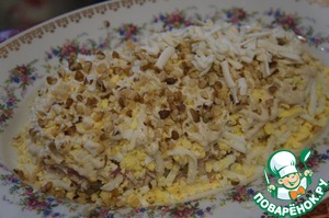 Далее слоями выложить отжатый лук, кукурузу и яйца, посыпать грецкими орехами. На каждый слой наносить сеточку из соуса.
