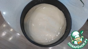 • Теперь самое интересное - собираем наш торт! в разъемную форму кладем корж, пропитываем его и смазываем частью сметанного крема.