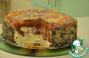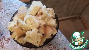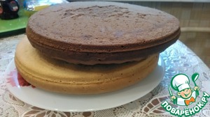• Коржи разрезать вдоль, каждый на 2 коржа. Один темный и один светлый корж порезать на небольшие кусочки.