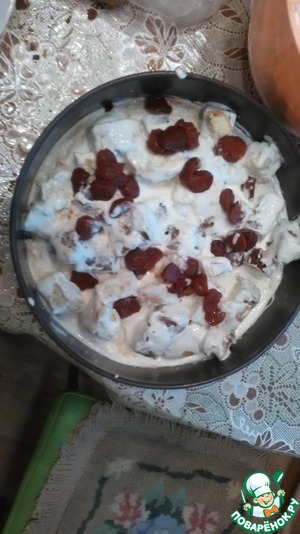 • Далее порезанные кусочки обмакиваем в крем и складываем в форму, чередуя с ягодами так, чтобы свободного места оставалось как можно меньше.