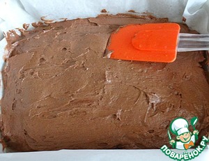 Форму смажьте маслом, застелите пекарской бумагой и выложите тесто. Разровняйте лопаткой и поставьте в нагретую до 180 гр. С духовку на 20-25 мин. После того, как испечётся тесто, его нужно остудить на решётке. -
