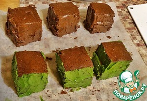 Три пирожных обмазать со всех сторон шоколадным кремом, а три зелёным кремом из чая " матча".