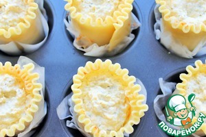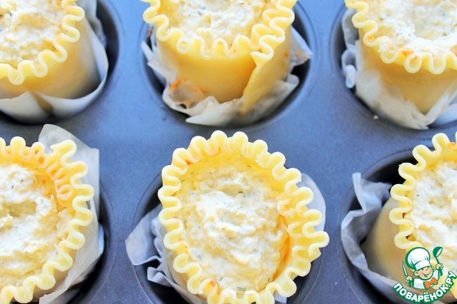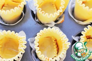 В формочки кладем пергамент и смазываем маслом. Выкладываем пластину для лазаньи в виде бочонка. Одну-две пластины порежем на квадратики.