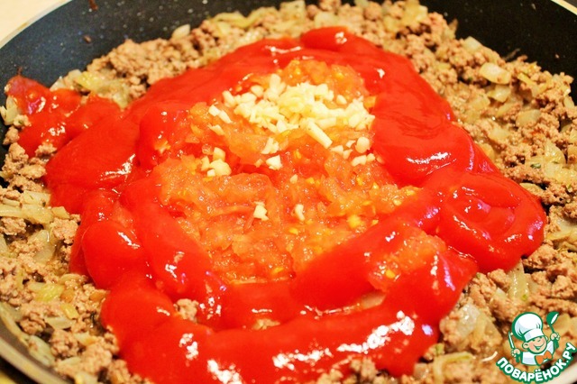 Измельчаем чеснок и добавляем к нашей обжарке. Далее добавляем томатную пасту или томатный соус, приправу Итальянских трав, соль сахар по вкусу. Помидор чистим от кожуры и режем на кубики. Добавляем к мясу. Убавляем огонь и тушим мясо на среднем огне 15-20 минут. -