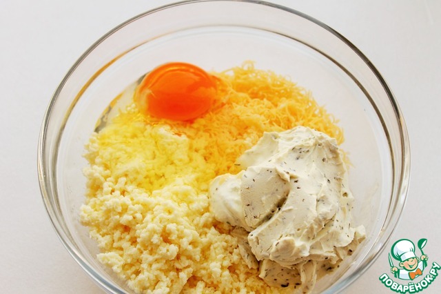 Сыр Рикотта, пармезан и половину моцареллы натираем на мелкой терке. Добавляем сыр Филадельфия с зеленью и яйцо. Тщательно перемешиваем