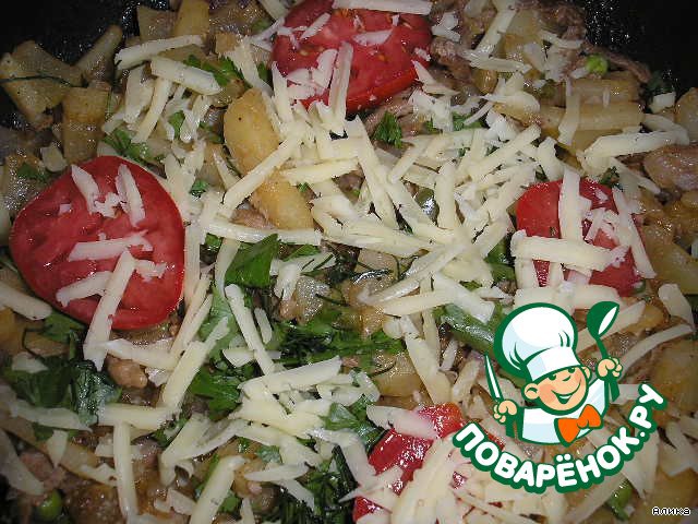 Помидоры нарезать кружочками, уложить на овощи и посыпать мелко нарезанной зеленью. Сыр натереть на крупной терке и посыпать готовое блюдо. Если не накрывать крышкой, то сыр не очень хорошо плавится, что и требуется!