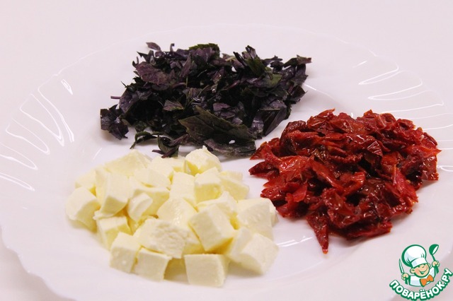 К муке добавим нарезанный мелко базилик, моцареллу и нарезанные вяленые томаты. Аккуратно перемешаем.