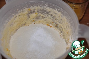 Муку просеиваем, смешиваем с содой и разрыхлителем и по частям добавляем в тесто, чередуя с апельсиновым соком. Всё хорошо перемешиваем.
