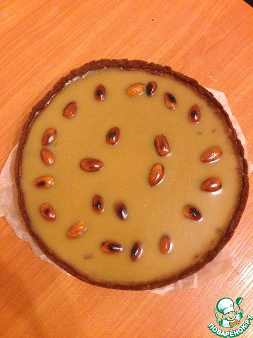 Выкладываем наше отдохнувшее шоколадное тесто, формуем бортики. Тесто податливое и очень просто распределяется без скалки. Ставим основу в разогретую до 180 градусов духовку минут на 10-15