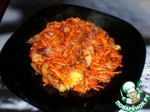 Лук нарезать мелко, морковь натереть. Обжарить на растительном масле до мягкости, затем добавить наш соус и протушить 5 минут, помешивая.