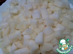 Очистить картофель, нарезать кубиками и тщательно промыть в нескольких водах, чтобы удалить крахмал.