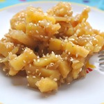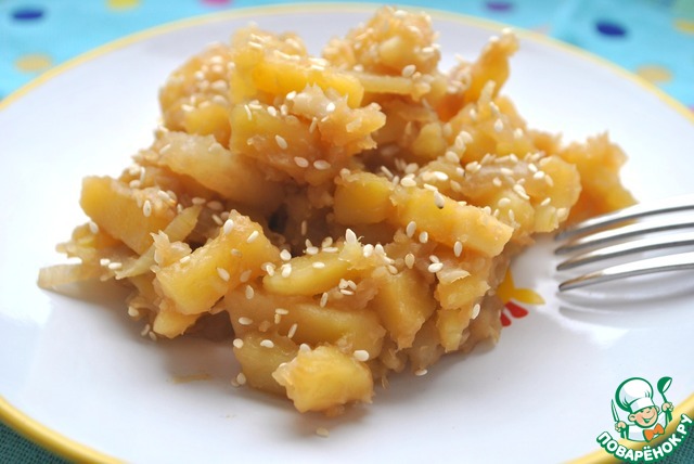 Вылейте разведенный крахмал в картофель. Все перемешайте и снимите с плиты. Добавьте в картофель кунжутное масло по вкусу и посыпьте семенами кунжута. Вот и все!