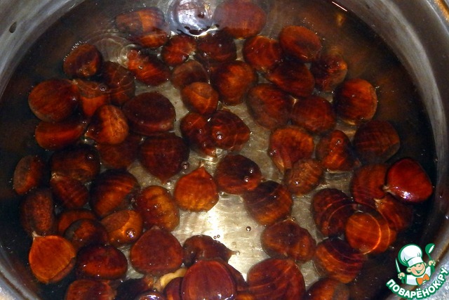 Потом я положила в сироп каштаны, довела сироп снова до кипения и варила 5 минут. Выключила огонь и оставила каштаны остывать в сиропе. Такую процедуру надо повторять 3-4 дня подряд через 24 часа. За это время сироп сильно загустеет, станет тягучим.